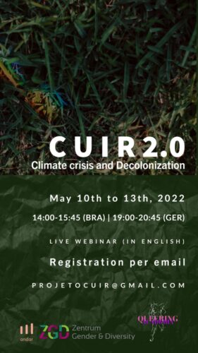 The CUIR Series is back! Together with Terceiro Andar and Queering Academia we invite you to a four-day series (10./13. Mai) of courses on decolonial and intersectional approaches to the climate crisis with guest speakers from Brazil and Germany. The subversive potential of decolonial and intersectional thinking leads us to rethink ourselves, political paradigms, and even world history. Challenging the western world order and its hegemonic narrative is a necessary step if we are to meet the next challenge facing the human species: the climate crisis. For this reason, Brazilian and German professors will engage in indirect dialogue to reconfigure the practical perspectives of ecological thinking to include decoloniality and intersectional perspectives of gender and class.